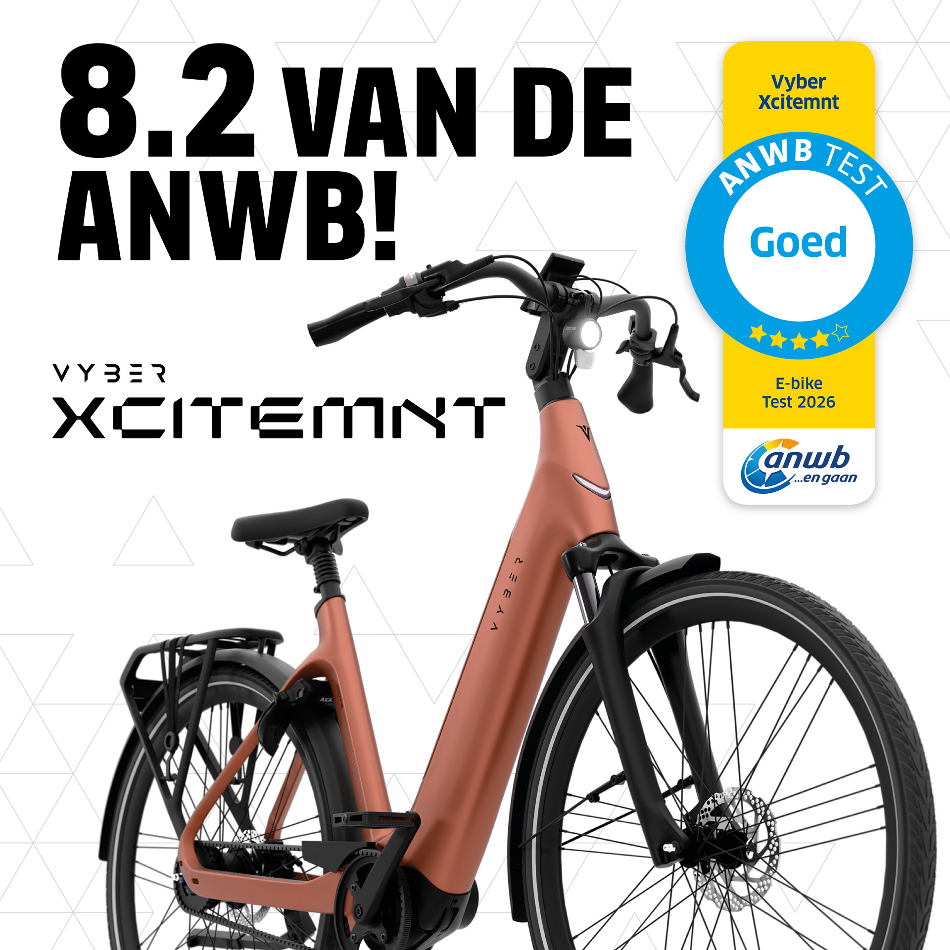 De Vyber Xcitemnt heeft in de ANWB E-biketest 2026 een 8,2 gescoord. Daarmee behoort hij tot de beter e-bikes van het deelnemersveld.